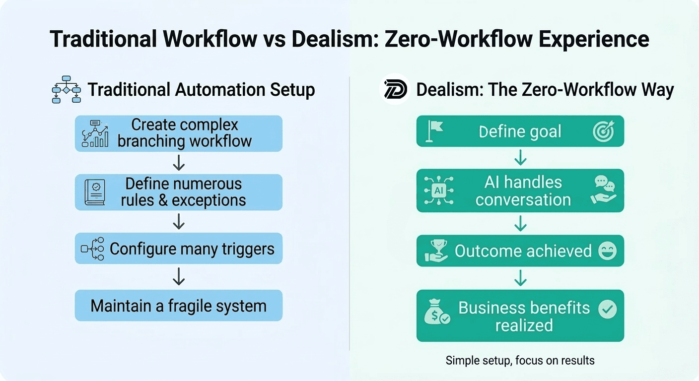 A major barrier to automation has always been complexity. Traditional systems require businesses to design workflows, build rule trees, and maintain automation logic.