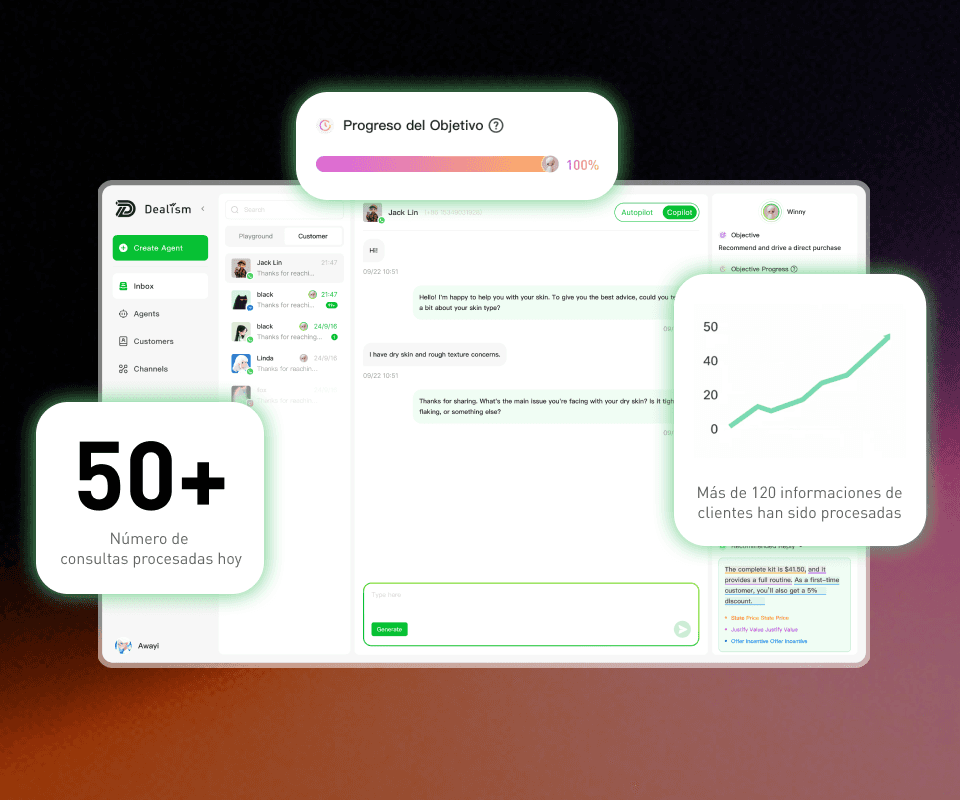 Dealism no solo responde preguntas frecuentes. Explica el valor, maneja la resistencia al precio y empuja a los clientes indecisos hacia decisiones de inscripción.