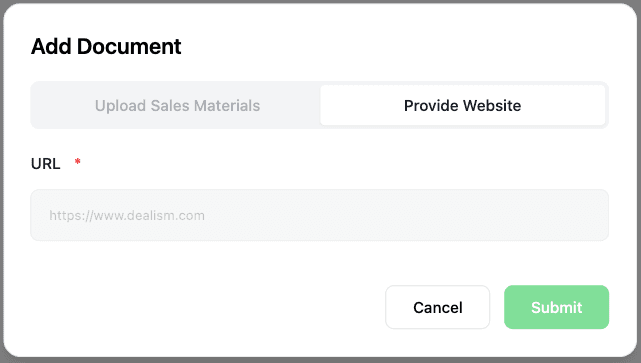 (1) Agregar Documento El Agente de Ventas puede aprender conocimientos de URLs o archivos proporcionados (incluyendo formatos doc, docs, pdf y txt) y analizarlos en fragmentos de conocimiento utilizables, que se almacenan en Conocimiento como Documentos.