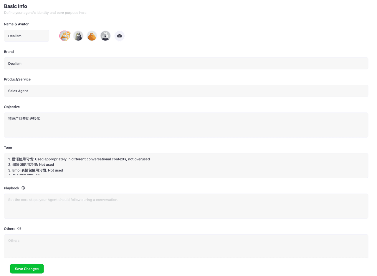 La Información Básica se utiliza para gestionar la información básica de un Agente de Ventas, incluyendo el nombre del Agente, su avatar, marca, alcance de productos/servicios, objetivos de ventas que se deben alcanzar durante las conversaciones, tono y estilo de comunicación con los clientes, y los pasos y requisitos que el Agente de Ventas debe seguir durante las interacciones con los clientes.