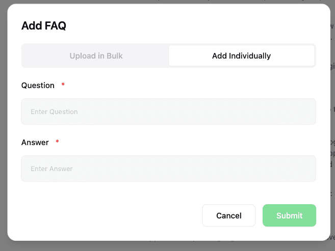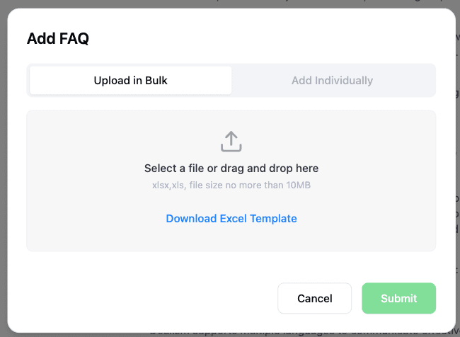 También se admite la carga masiva de preguntas frecuentes utilizadas con frecuencia para el Agente de Ventas utilizando el formato de plantilla de Excel.