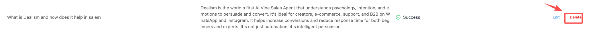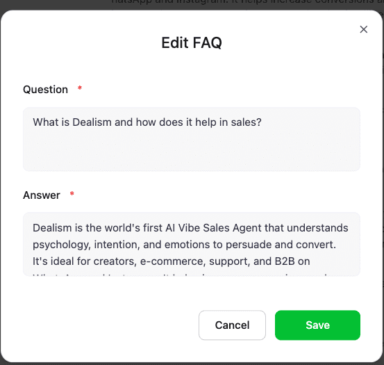 Seleccione la FAQ que desea modificar y haga clic en el botón Editar para actualizar la pregunta y la respuesta.