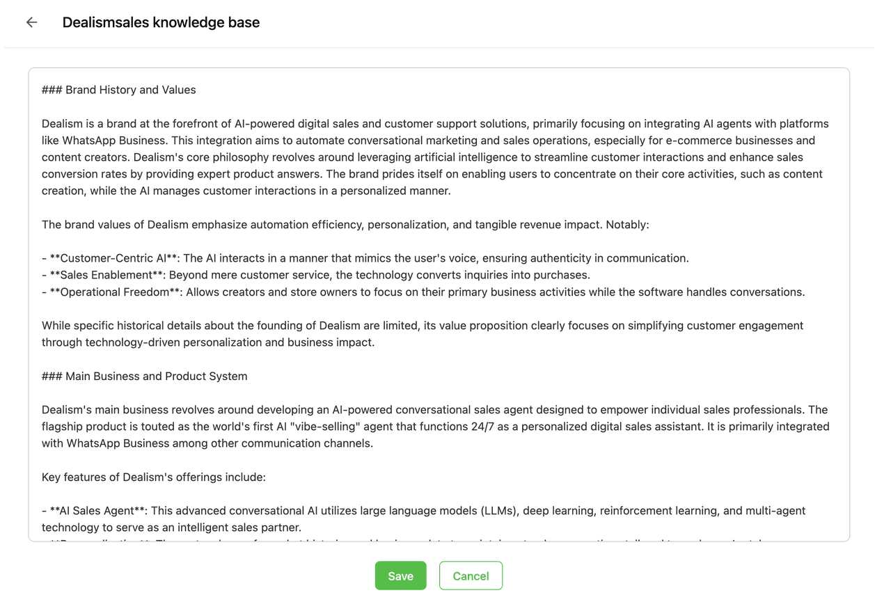 El conocimiento se utiliza para gestionar el conocimiento adquirido por el Agente de Ventas, incluyendo varios tipos como Documento, FAQ, Lista de Productos y Caso de Uso. Permite a los usuarios cargar directamente nuevos materiales de aprendizaje, ver el conocimiento adquirido por el Agente y editar o eliminar el contenido aprendido.