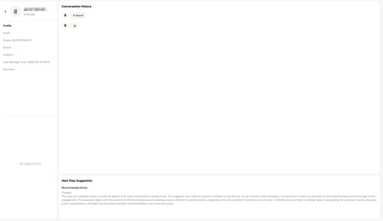 Los clientes se utilizan para ver información y análisis de ventas de los clientes que han interactuado con el Agente, incluidos la información básica del cliente (por ejemplo, correo electrónico, teléfono, tiempo de comunicación), registros históricos de conversaciones, progreso de ventas y las recomendaciones del Agente de Ventas para las próximas acciones de ventas.