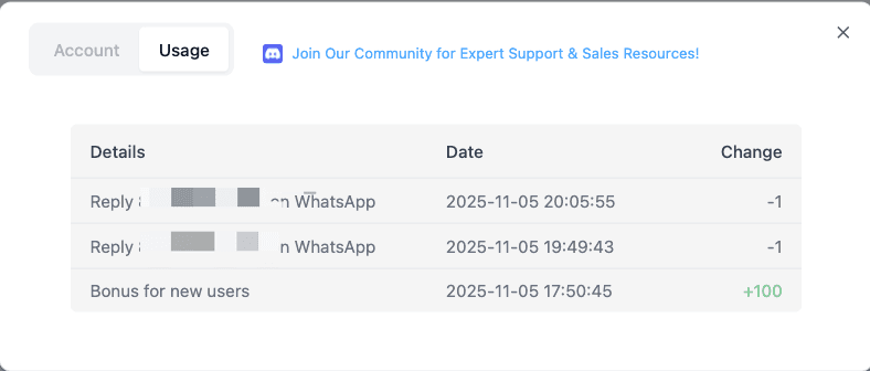 Utilizado para mostrar los detalles del uso, incluyendo las adiciones y el consumo de respuestas recomendadas por IA generadas por la cuenta históricamente.