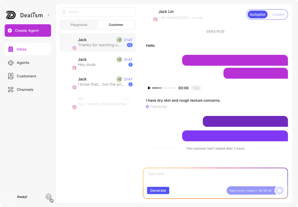 Para empresas que usam o Instagram como um canal de comunicação principal, o Dealism ajuda a transformar chats cotidianos em ações. Em vez de monitorar a caixa de entrada ou enviar respostas rápidas manuais, o agente mantém as conversas avançando para o próximo passo.
