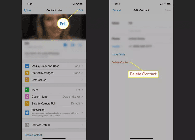 No iPhone, os contatos do WhatsApp também são sincronizados com o aplicativo Contatos do seu dispositivo. Remover um contato o exclui de ambos os lugares.