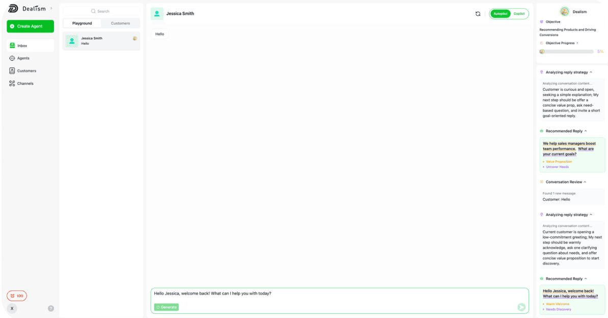 A Dealism.ai não é um bot simples. Ela combina ações automatizadas com conversas inteligentes de múltiplas turnos. Ela entende a intenção do usuário, adapta o tom e a mensagem, lida com objeções e guia ativamente os usuários rumo à conversão.