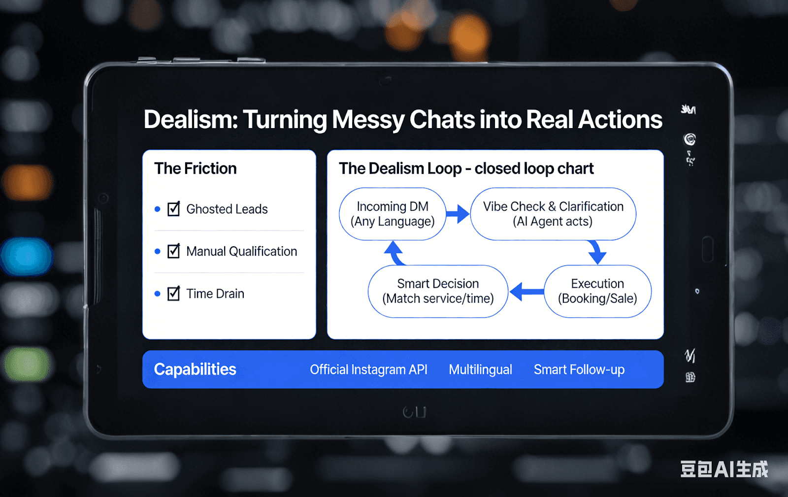Diferente das ferramentas tradicionais que simplesmente "respondem" a mensagens, um chatbot de IA do Instagram alimentado por Dealism funciona como um verdadeiro membro da equipe humana. Ele entende a "vibe" da conversa, esclarece as necessidades do usuário e avança o processo de negócios—seja agendando uma consulta médica, programando uma sessão de coaching ou qualificando um lead de alto valor.