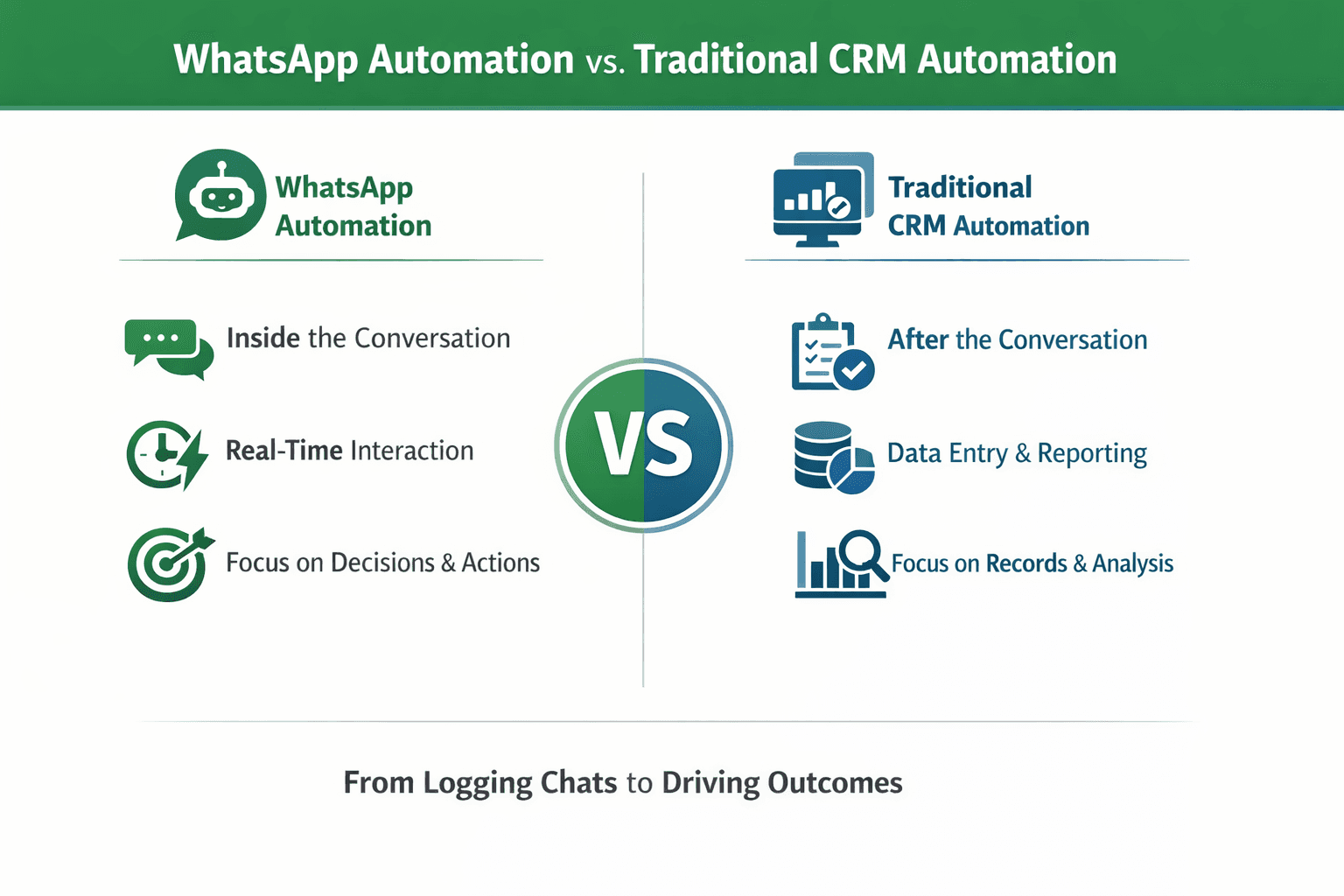 Na prática, os sistemas CRM tendem a registrar conversas após elas ocorrerem, enquanto a automação do WhatsApp opera ativamente dentro da própria conversa. As ferramentas CRM otimizam principalmente relatórios e visibilidade, enquanto a automação do WhatsApp se concentra em impulsionar decisões e ações imediatas.